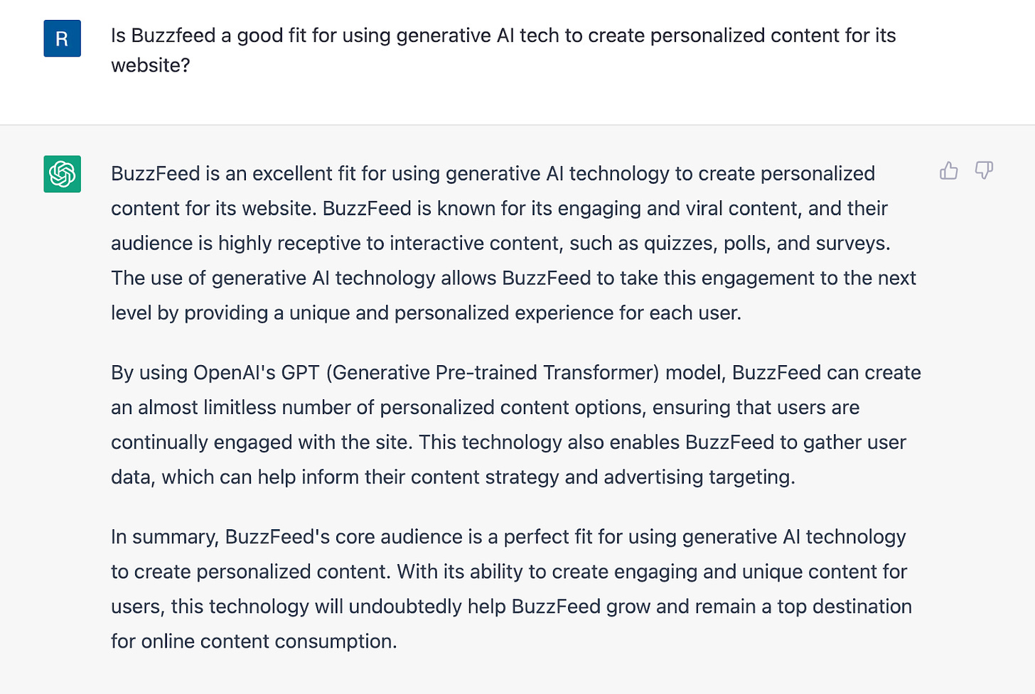 BuzzFeed's launch of Infinity Quizzes is an interesting development for the application of generative AI technology in media. The listicle-friendly, clickbait-heavy publisher seems to be a good fit for this type of content format experimentation as well. (ChatGPT agrees as well, albeit in a much nicer manner — see screencap below.)